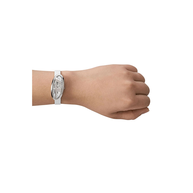 Diesel's19mm D-Era watch features a white dial, two-hand movement and white leather strap.