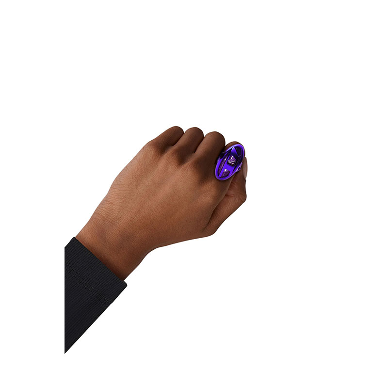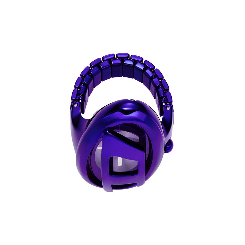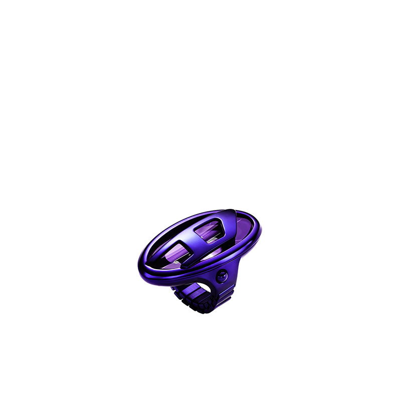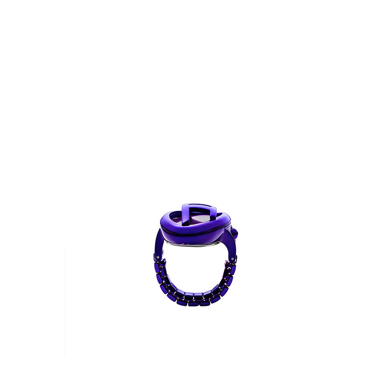 Diesel's 19mm D-Era ring watch features a purple sunray dial, two-hand movement, and a purple stainless steel stretchable ring band attachment.