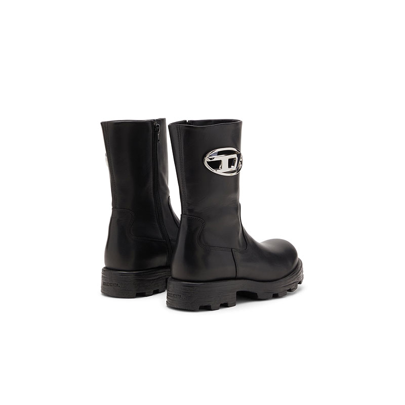 Rugged with a touch of polish, these women’s biker boots are crafted from shiny black leather with wide, zip-fastening shafts showcasing gleaming silver Oval D hardware – the plaque is inserted into a cut-out, creating a peekaboo effect. The lug soles will keep you surefooted on any terrain.