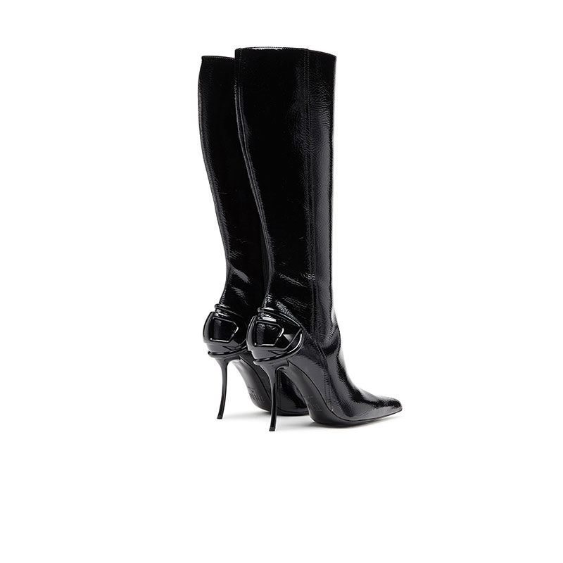 Designed with sharply pointed toes, these women's knee boots feature a distinctive wrinkled texture and glossy finish. Sleek Oval D hardware wraps the back of the shoe and merges with the elegantly curved heel – this stiletto offers 105mm of lift. Side zips ensure they're easy to slip on and off.