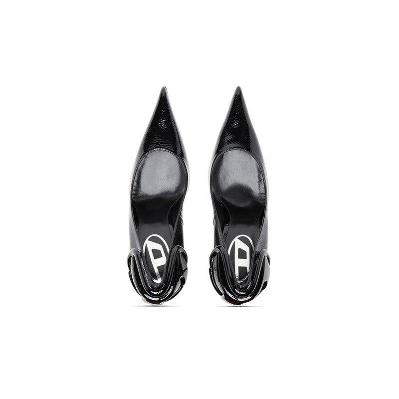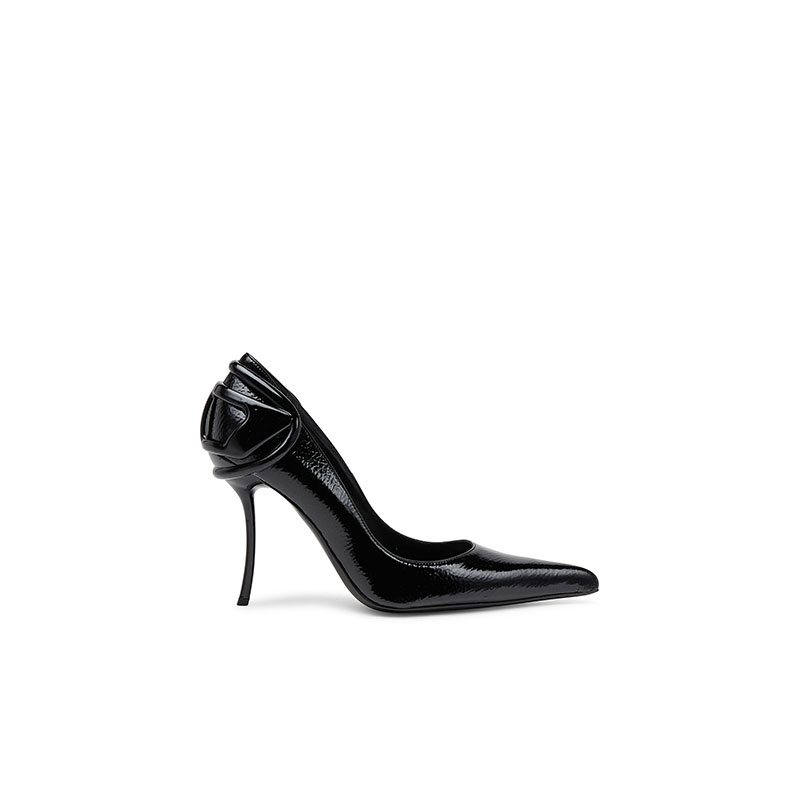 This women's 105mm stilettos add serious lift – the elegantly curved heel anchors the sleek Oval D embellishment that wraps the back of the shoe for a unique logo touch. They have a glossy, wrinkled texture and sharply pointed toes.