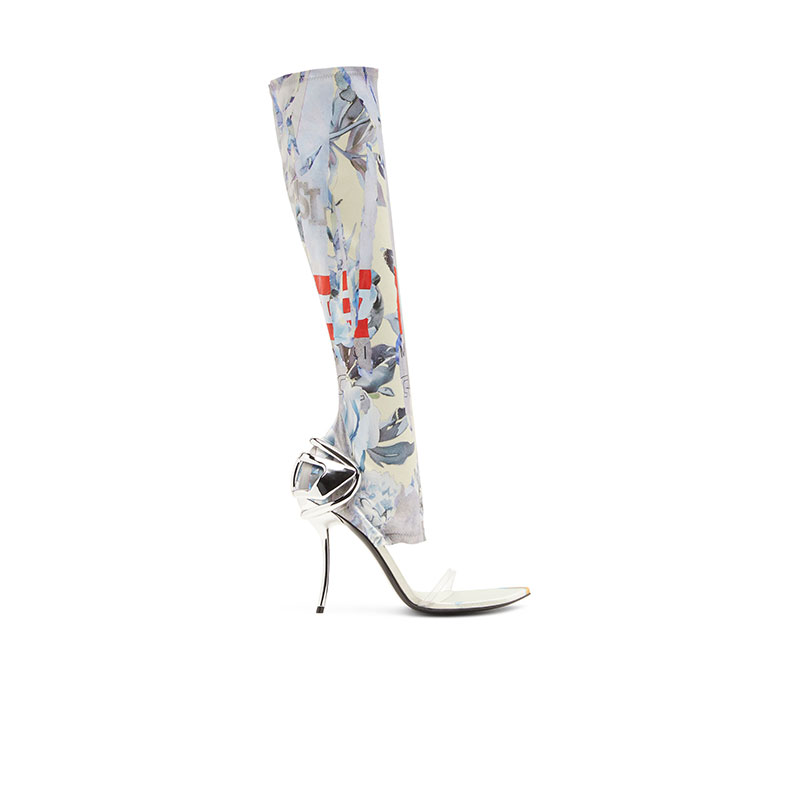 Fusing fashion and music, these women's shoes are part of the Remaster capsule, celebrating music’s transformative power by honoring influential DJs across the globe. The hybrid design, a cross between knee-high boots and strappy sandals, features the hallmarks of Diesel's unmistakable Ten & A Half silhouette – a sleek Oval D wraps the back of the shoe and merges with the elegantly curved heel. The printed graphics are unique to the collection.