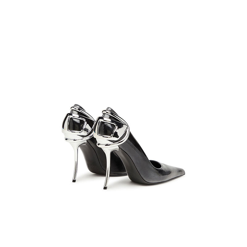 A new iteration of the iconic Ten&Half stiletto, these point-toe pumps are made from patent bicolour pull-up leather. When stretched, the ultra-glossy material allows the colours to blend into a sleek black hue with a veil of smoky grey. The back of the shoe is a display of artisanal expertise, wrapped with silver chrome Oval D hardware that plummets into a showstopping 10.5cm heel with an elegantly curved profile.