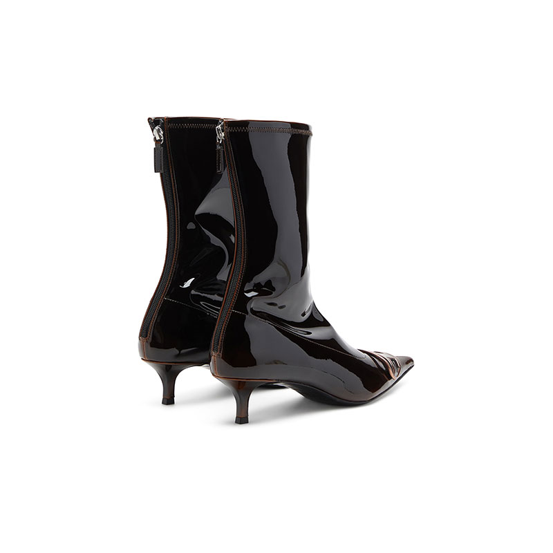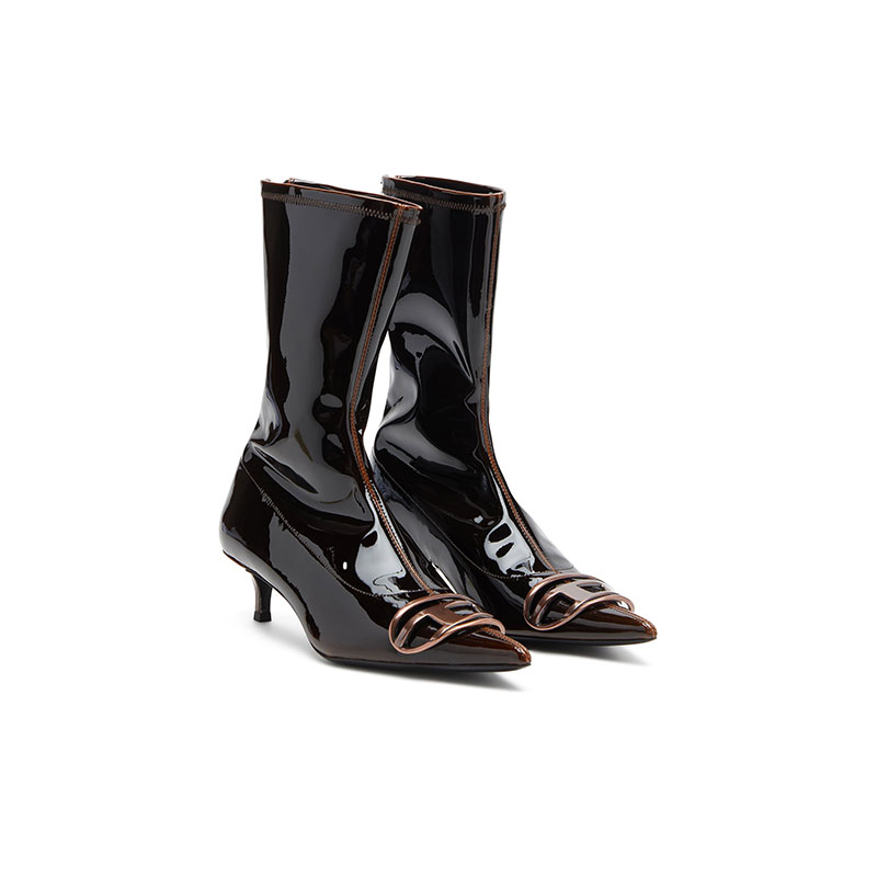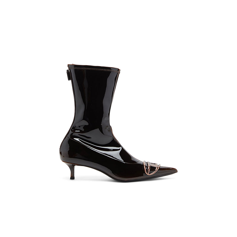 Made from patent pull-up PU, these women’s ankle boots gleam with a liquid-like shine. The material is black with a burgundy red layer underneath and when stretched allows the base colour to 'pull up', creating the dynamic two-tone effect. Designed in a sock-like silhouette with a zip at the back, these shoes have sharply pointed toes embellished with copper-tone Oval D hardware and rest on comfortable 4.5cm kitten heels.