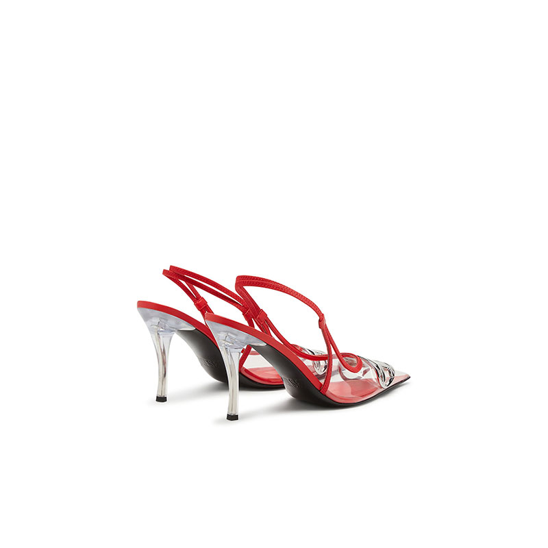 These women’s TPU and leather pumps cut a transparent silhouette with flashes of red. Featuring pointed toes embellished with gleaming Oval D hardware, they’re fitted with elasticated slingback straps and set on leather soles. The 9cm clear heels keep the attitude stiletto high.