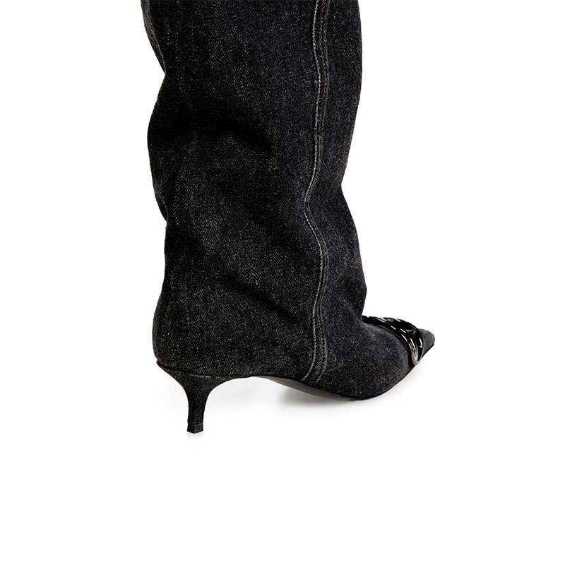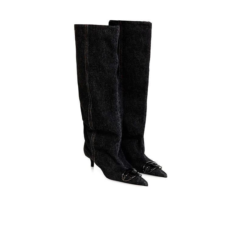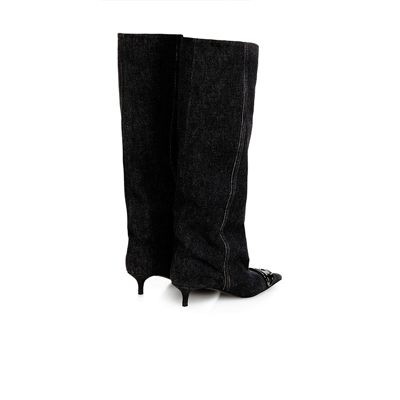 Slouchy in blue denim, this women's boot adapts to every mood. The knee-high shaft can be turned down to reveal its soft leather lining, scrunched for laissez-faire ease, or worn tall with a contemporary edge. Gunmetal-tone Oval D hardware defines the pointed toe. Set on a 4 cm kitten heel – elevated yet effortless – the shoe brings poise without the pinch.