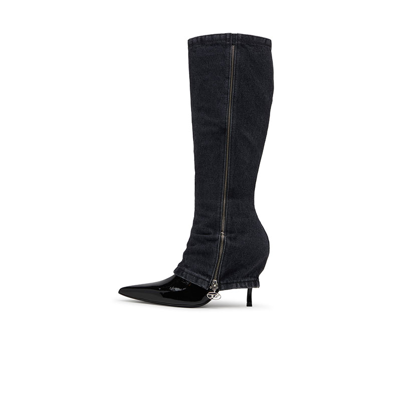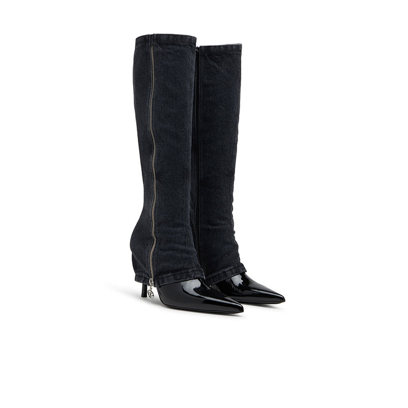 Innovation meets the spirit of the ‘80s. These women’s knee boots from the SS25 Runway Show are given a surreal twist through their game-of-trickery trompe l’oeil construction: the shaft in Diesel’s hero fabric – denim – gives the illusion of bootcut jeans. They’re crafted from glossy patent leather with sharply pointed toes and 9cm stiletto heels. The signature Oval D pull at the outer metal zip adds a subtle yet distinctive logo touch.