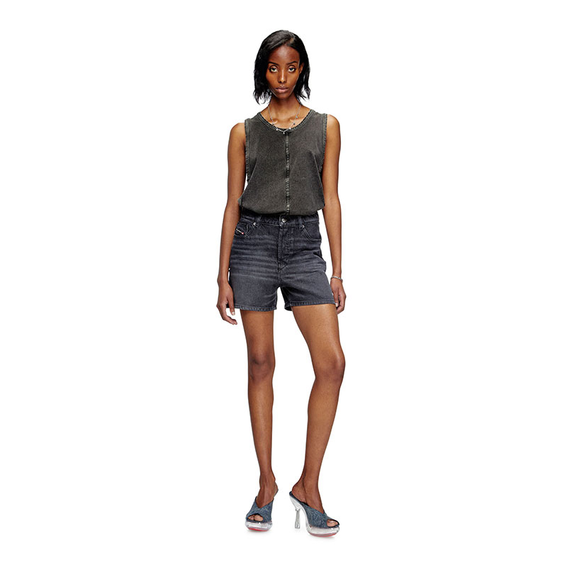 Women's denim five-pocket shorts cut to mid thigh, with a straight fit and medium waist. Crafted using partially recycled cotton, this fix denim features a black wash with subtle whiskers and tonal stitching.