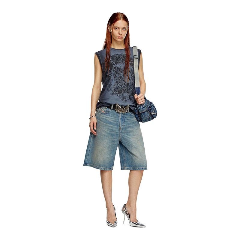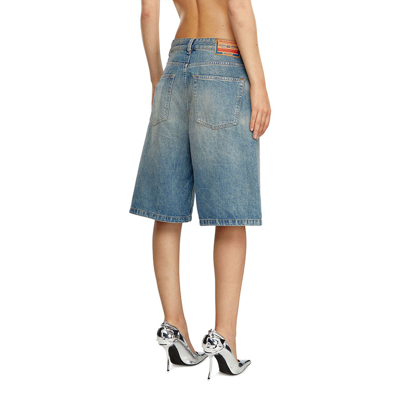 Women's denim five-pocket shorts with a relaxed-leg, knee-length fit.