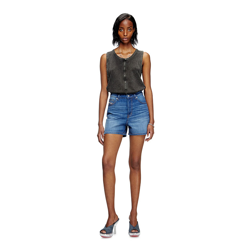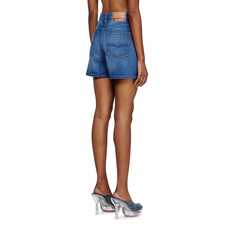 Women's denim five-pocket shorts cut to mid thigh, with a straight fit and medium waist. The style is crafted from fix denim in partially recycled cotton, and features a treated medium blue wash with a worn look.
