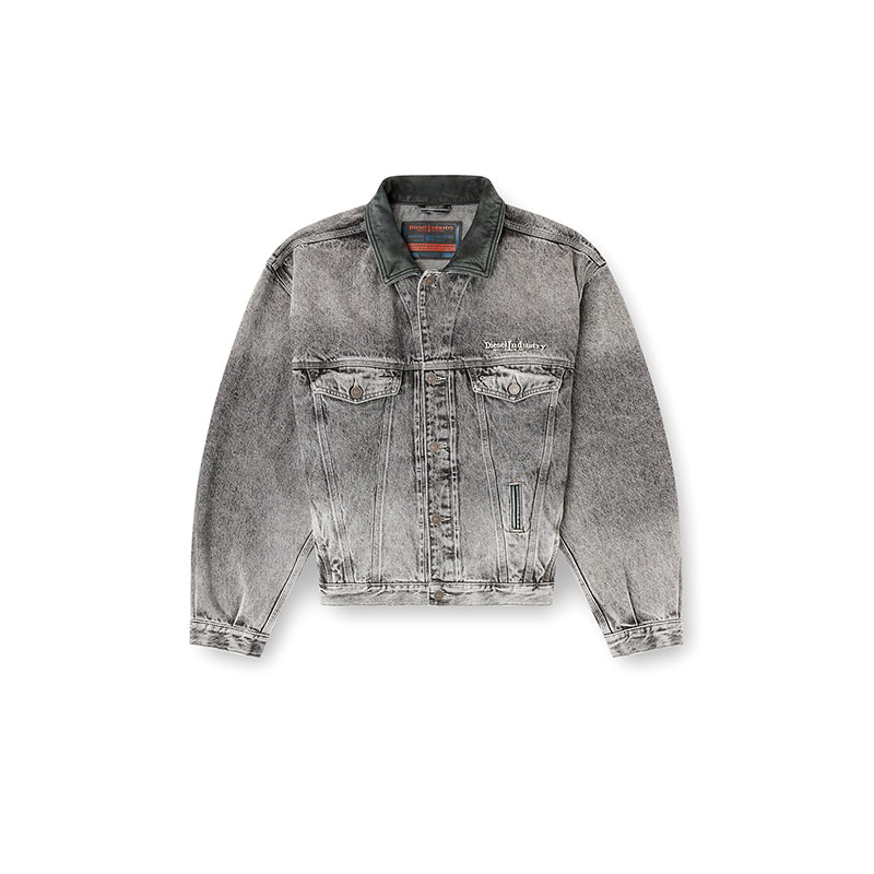 A bold reinterpretation of archival design, this trucker jacket channels '80s aviator energy with its oversized shoulders and slightly cropped, slim-cut hem. It's crafted from grey cotton and hemp denim, stonewashed and treated with bleach effects that enhances the raw look and feel. The tonal leather collar and embroidered Diesel Industries logo complete this iconic style, fusing a retro attitude with contemporary edge.