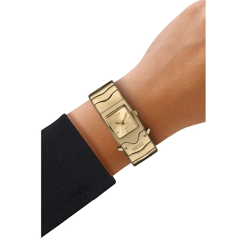 Diesel's 22mm Closer watch features a gold sunray dial, three-hand movement, and a gold-tone stainless steel bracelet with a buckle closure.