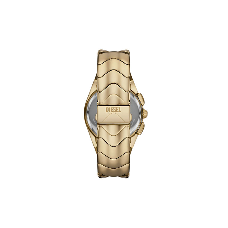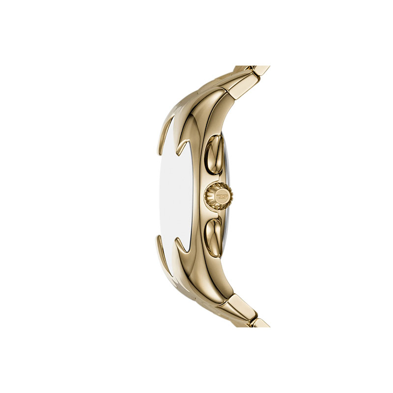 Diesel's 45mm Mercurial watch features a gold sunray dial, chronograph movement, and a polished gold-tone stainless steel bracelet.