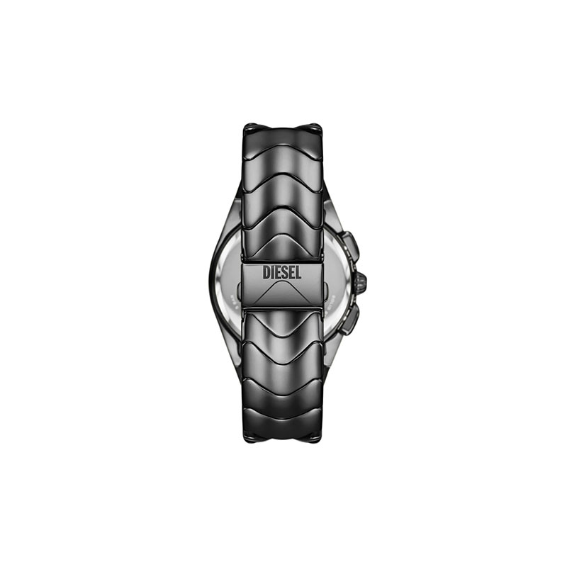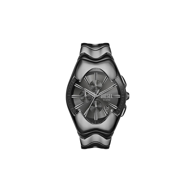 Diesel's 45mm Mercurial watch features a black sunray dial, chronograph movement, and a polished black-tone stainless steel bracelet.
