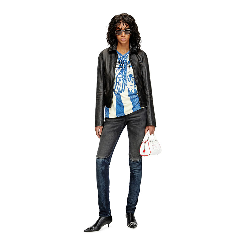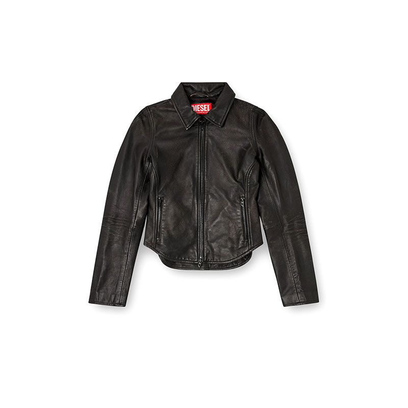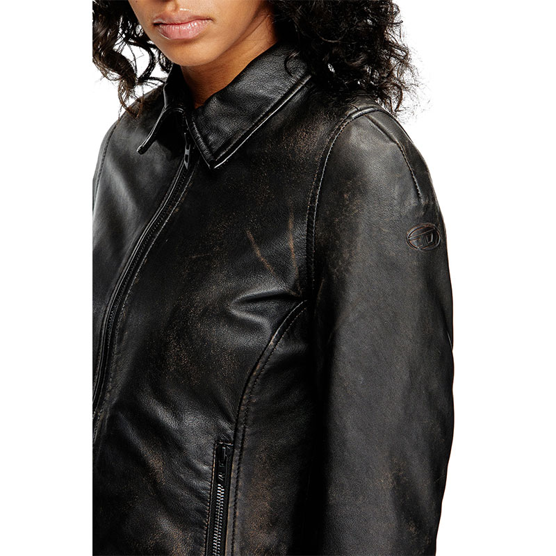 Women's fitted jacket with a pointed collar and curved hem. Crafted from responsibly sourced leather dyed a deep shade of brown, this distressed style has a broken-in feel, courtesy of fading and scuffs that reveal lighter undertones of the hide. It’s hallmarked with an embossed Oval D logo on the sleeve and fully lined for smooth layering.