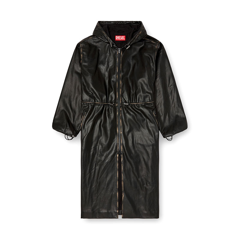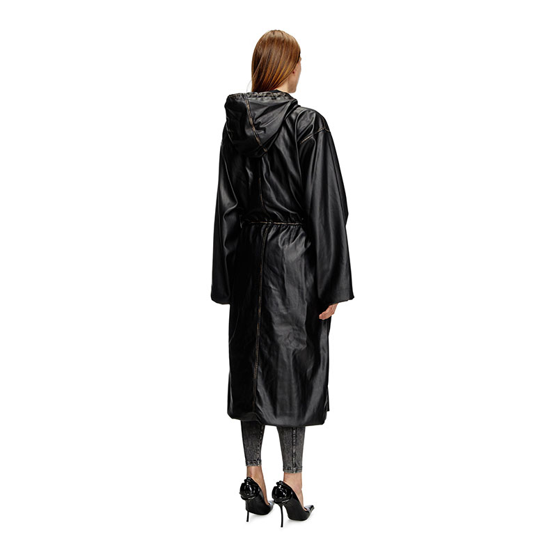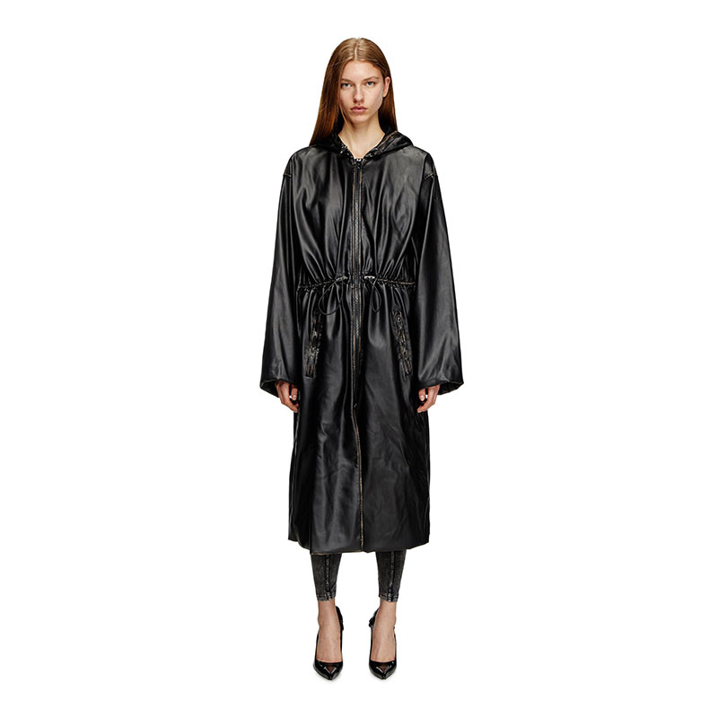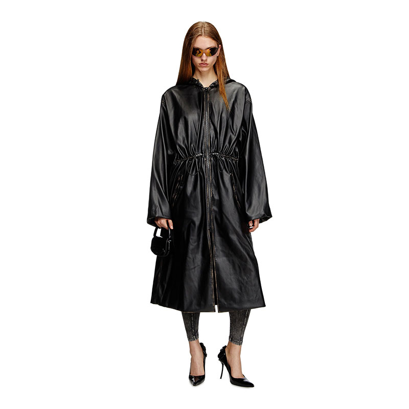 This oversized coat is a genderless piece that fuses utility with unexpected materials. Made from sleek and pliable synthetic fabric full of characterful, weather patina, it has a zip-fastening front and drawstrings to shape the hood, waist and cuffs. An embossed Oval D logo accents the sleeve.
