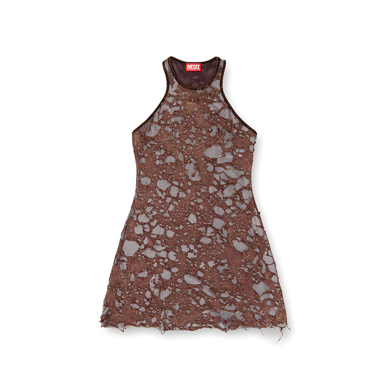 A marble wash and devoré treatment give this women's slim-fit racerback dress a heavily destroyed look: the brown cotton is burnt away to reveal the sheeny grey fabric beneath through tattered holes. Finished with an embroidered Oval D on the chest.