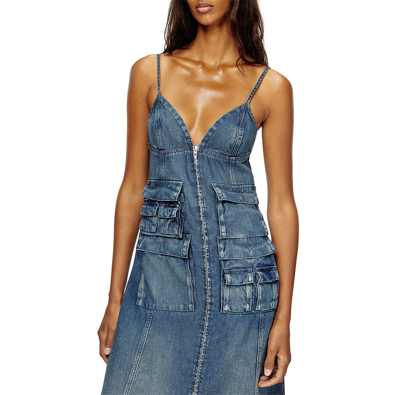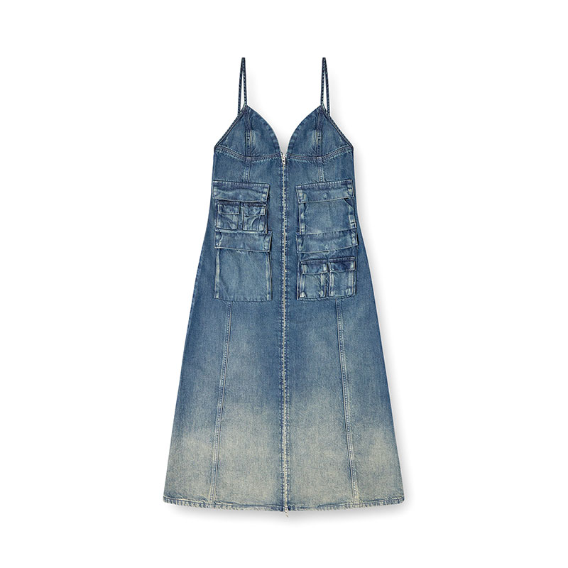 This women's mid-length dress is designed with a straight, empire-waist silhouette. The style features thin, adjustable shoulder straps and a front zip that's both decorative and functional. Cargo pockets add a signature utilitarian twist.