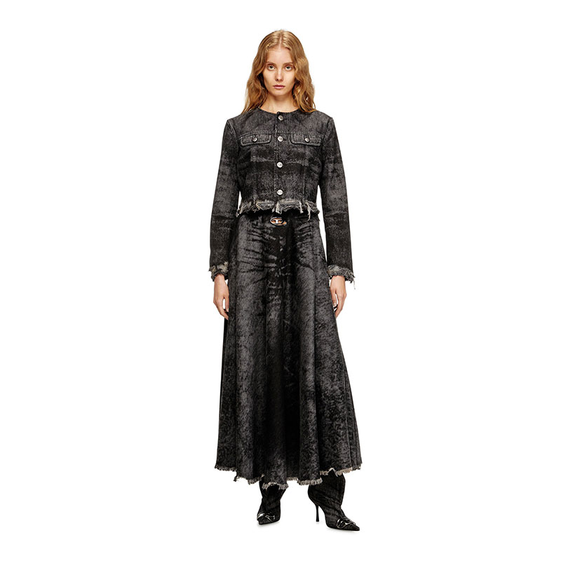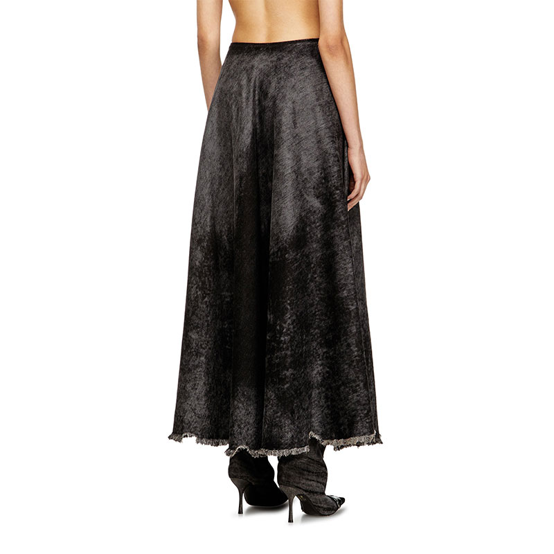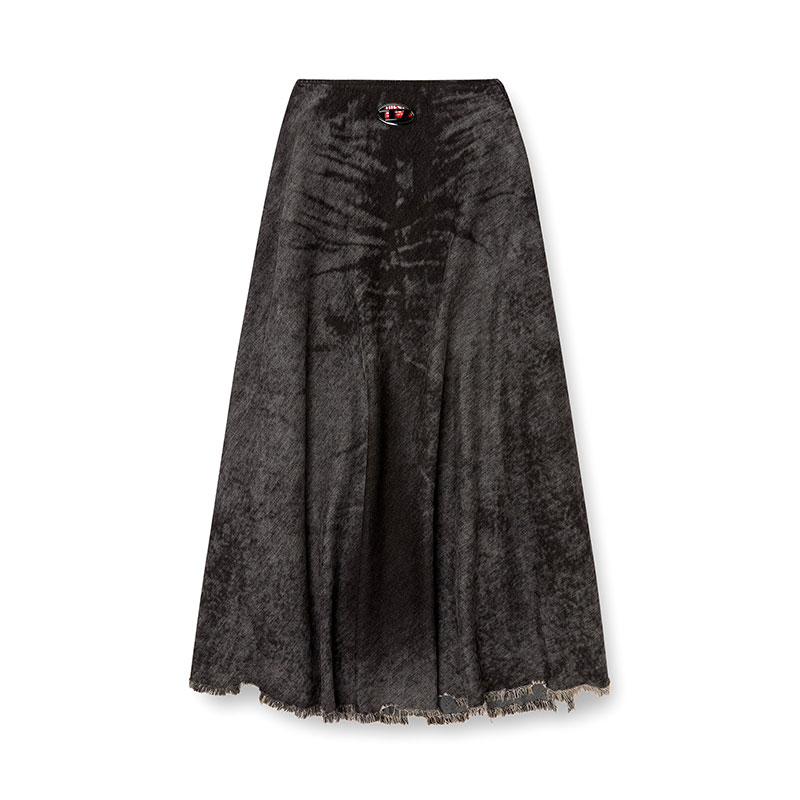 The metallic Oval D in the centre of this women's long skirt has become part of Diesel's style codes. Heavily frayed hems complete the Fall Winter 2025 Runway look.