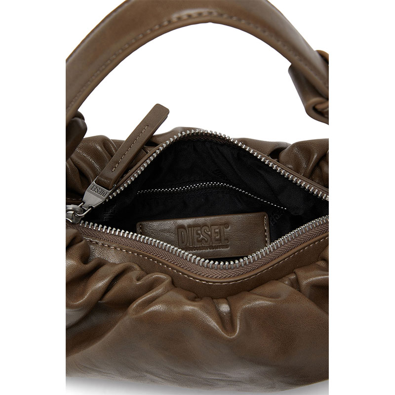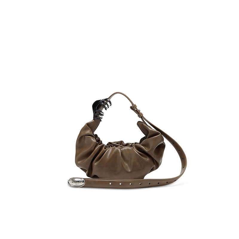 An exclusive FW25 Runway Show style, this women's small handbag boasts a slouchy hobo silhouette, gathered along the zip for a scrunched effect. Exquisitely soft and shiny, our women’s hobo bag features an innovative belt-inspired handle punctuated with a hair clip. The handle extends into a dangling strap, showcasing the resin Oval D at the tip. Carry it by the top handle or over the shoulder.