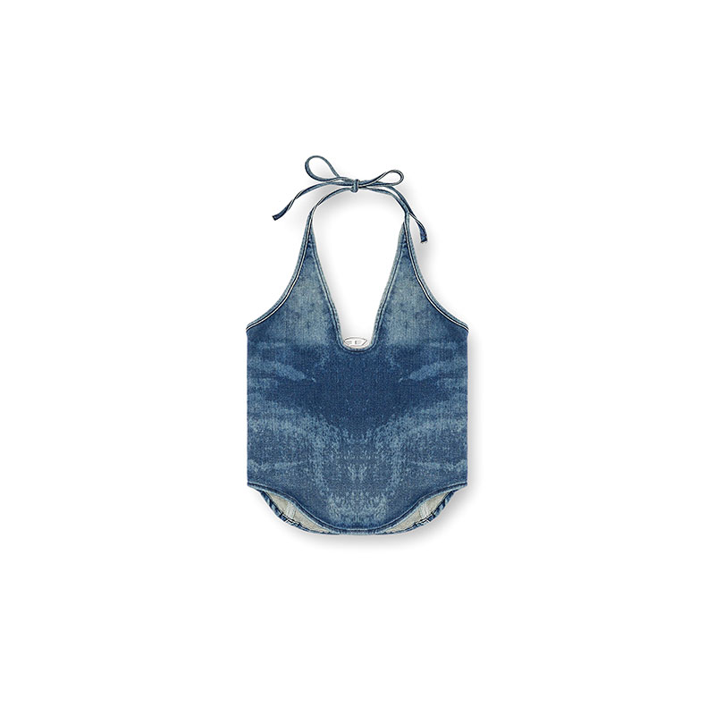 This women's halterneck top features slim straps and an open back. The V neckline is highlighted with a metal Oval D logo nestled at the bottom.