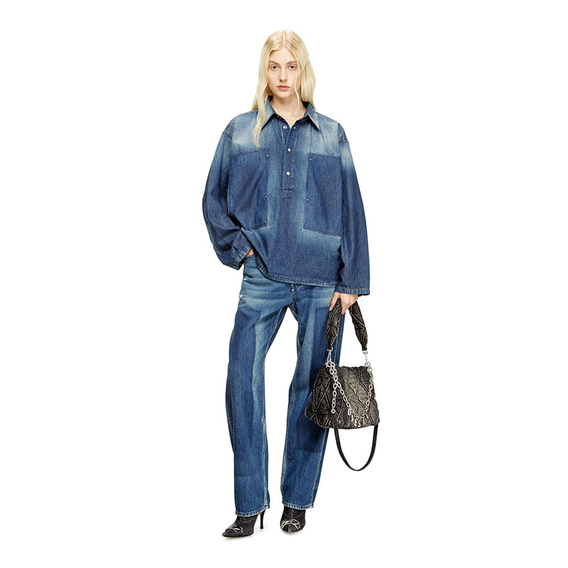 This women's long-sleeve top is cut to a boxy fit. It features a polo neckline with branded metal snap buttons, and wide patch pockets on the chest that open on the side. A small red D logo is embroidered on one sleeve. A tribute to Diesel’s experimental attitude, this medium blue wash undergoes a unique patch-effect treatment to create daring light and dark motifs. Patches are placed in key areas before sanding, stone washing, and spraying are applied, creating a clear-cut contrast once removed. Final touches like distressing and a used, dirty effect enhance its worn-in character.
