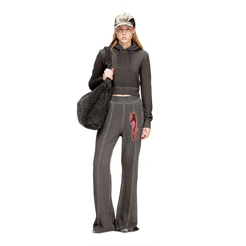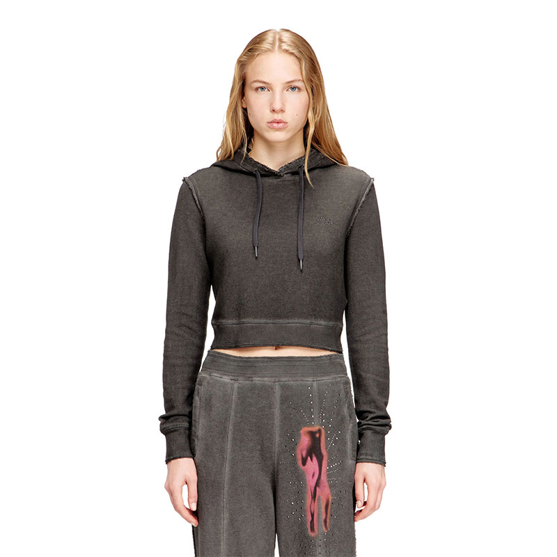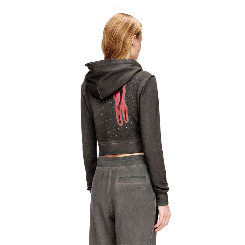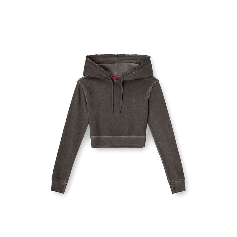 Women's slim-fit sweatshirt in grey melange jersey with a cold pigment treatment, crafted from organic cotton. The hoodie is characterized by raw edge details, a tonal Oval D logo with rhinestones on the front, and a digital print with studs on the back. Finished with a flat cotton drawstring with Oval D printed plastic tips.