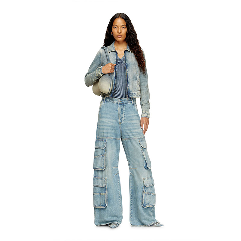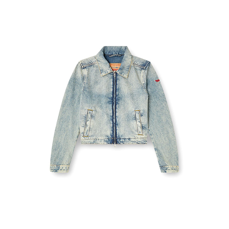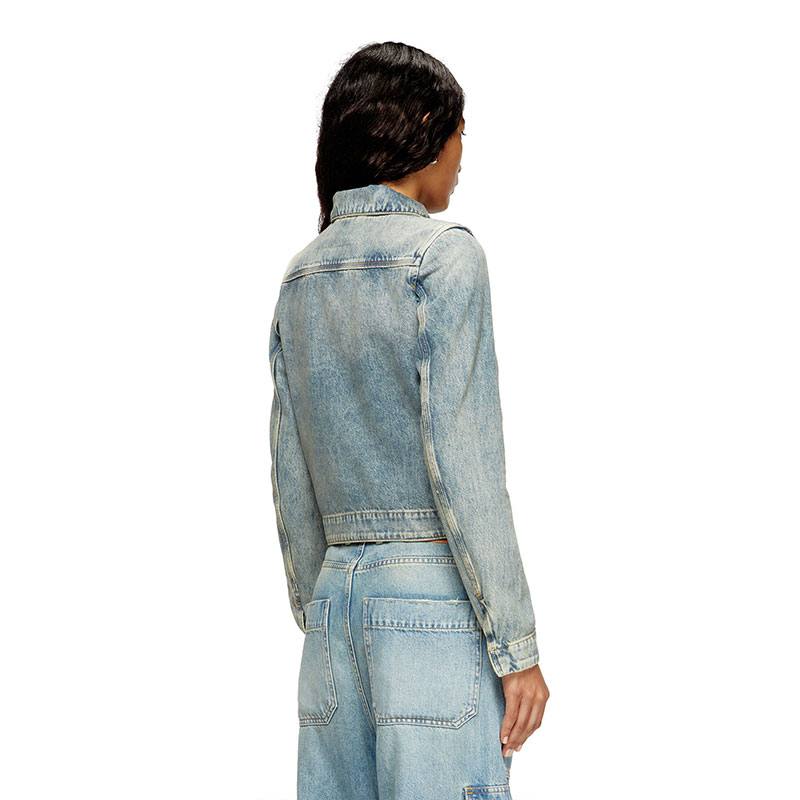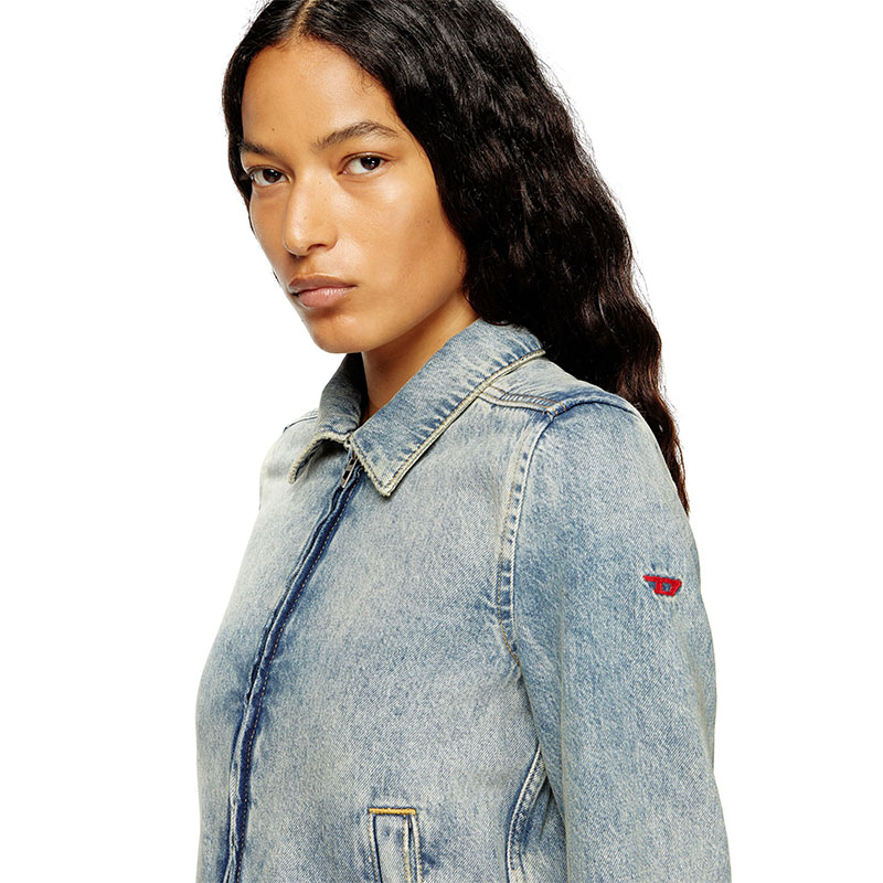 Women's jacket featuring a slightly cropped silhouette that nods to trucker styles. It features a shirt collar and a front zip with "D" shaped pullers. The pockets and cuffs are fastened with hidden snap-buttons.