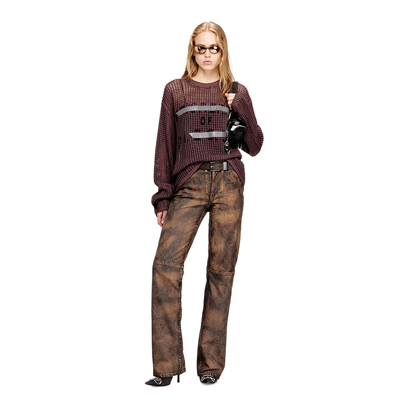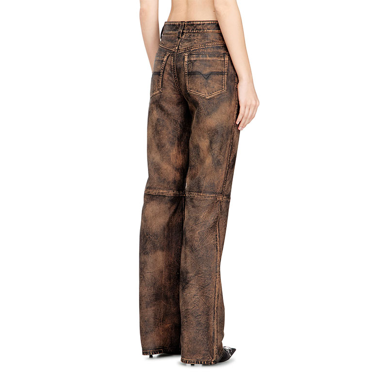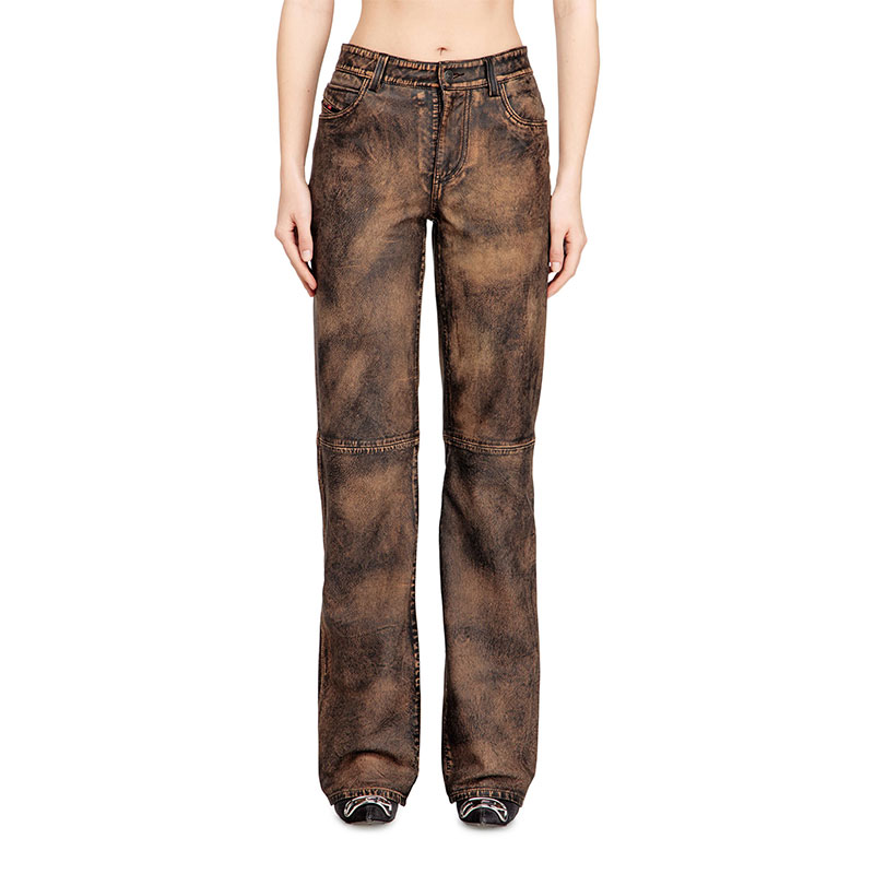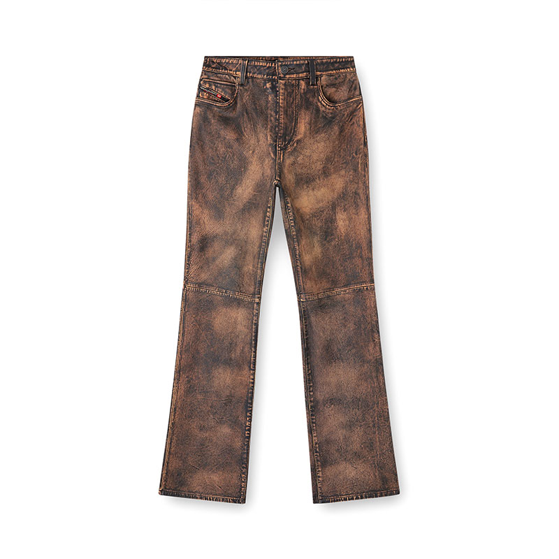 These women’s trousers are crafted from hand-brushed leather with a distressed, rugged patina. Cut for a regular fit with a zip fly and shank button closure, they have a classic construction of five-pocket denim. The diagonal logo flag on the small pocket is an iconic Diesel jean hallmark.