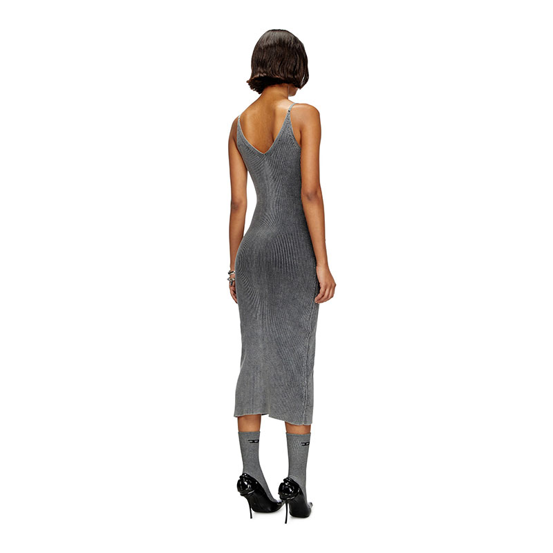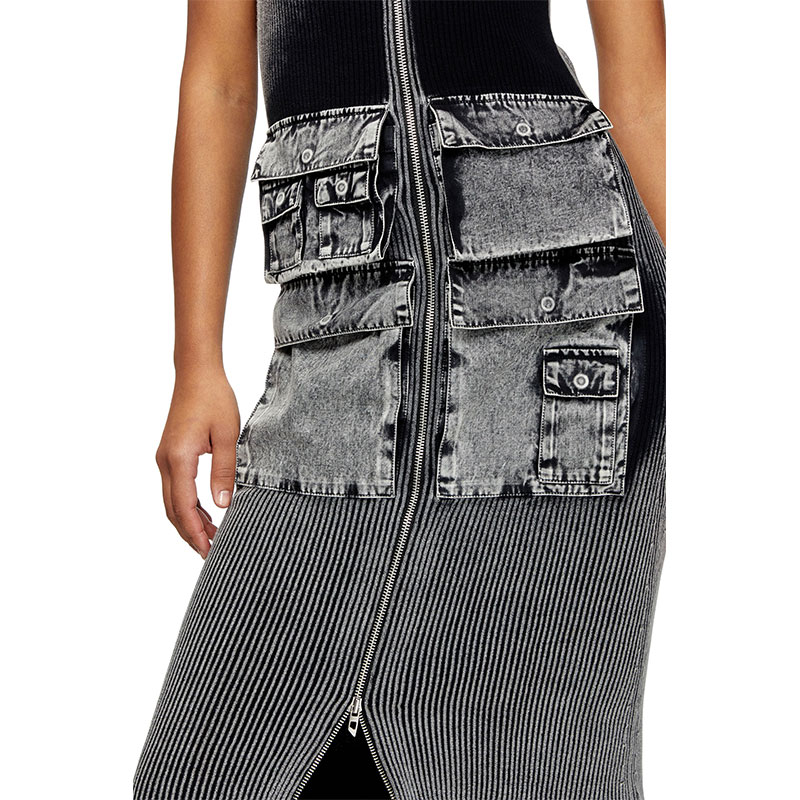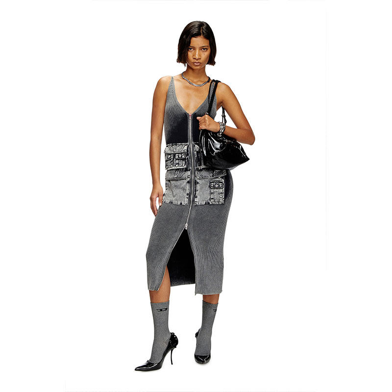 Women’s knitted dress for the utilitarian city dwellers. Made from black ribbed cotton knit that plays with saturation and fade, this midi has a figure-hugging shape juxtaposed with cargo pockets in marbled-effect fabric. The two-way zip cutting through the front adjusts the coverage at the V-neck and hem. Note the signature red lacquered D pull.