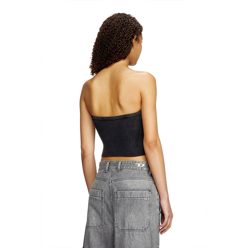 This women’s rib-knitted top is embellished with metal Oval D hardware directly over the bust – the cut-out design reveals slivers of skin. Crafted using black denim yarn spun with organic cotton, it has a strapless, tube silhouette and a subtly faded finish.
