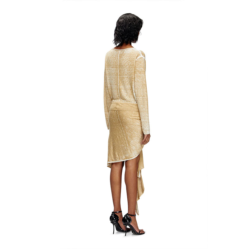 Knitted from lower-impact flax yarn, this long-sleeve dress features raw edges and fading for a dishevelled effect. Its loose shape has a slouchy feel, juxtaposing a ribbed V-neck top with a plain-knit wrap skirt. Cut-out Oval D on the chest.
