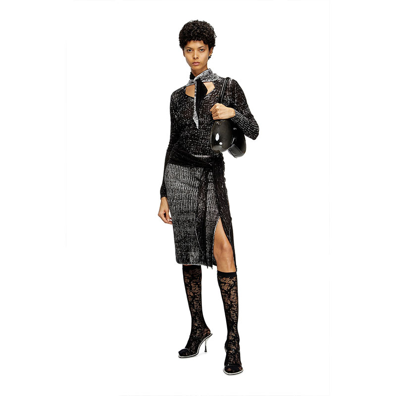This black midi skirt is knitted from lower-impact flax fibres. Featuring a wrap detail tying at the hip and a thigh-high slit, it's been dyed to leave fading along the ribbing for a worn look. An embroidered Oval D cut-out shows some skin.