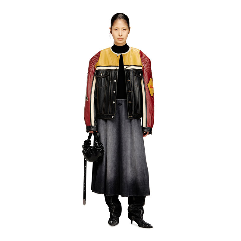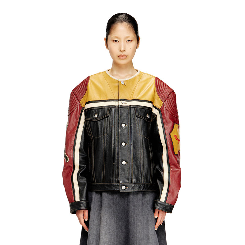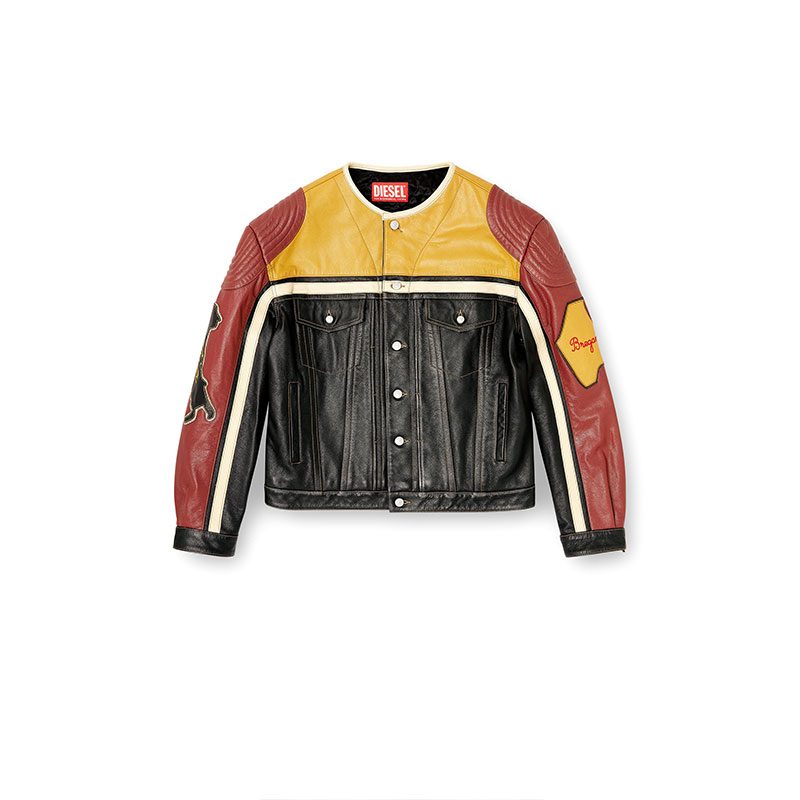 Biker jacket crafted from cow leather with a contrasting panel design, featuring quilted details on the shoulders, snap button closure, flap pockets and welt pockets on the front. Complete this unisex jacket the bold graphic patches on the sleeves with embroidered lettering and a large Diesel logo across the back for an iconic statement.
