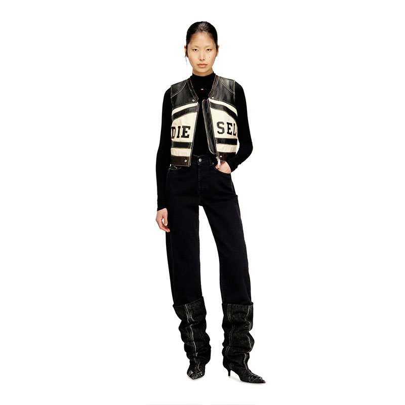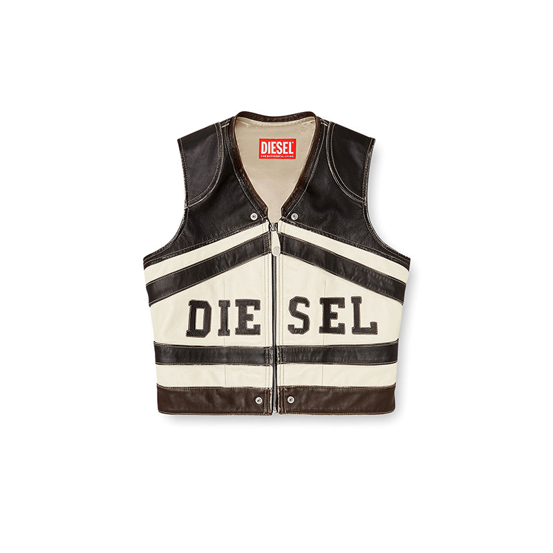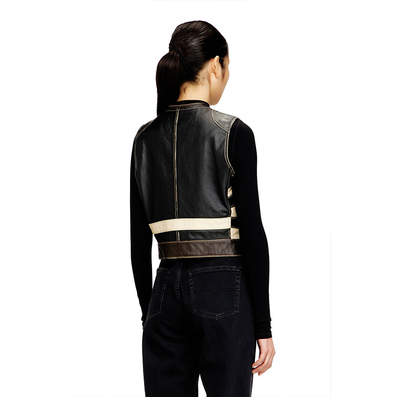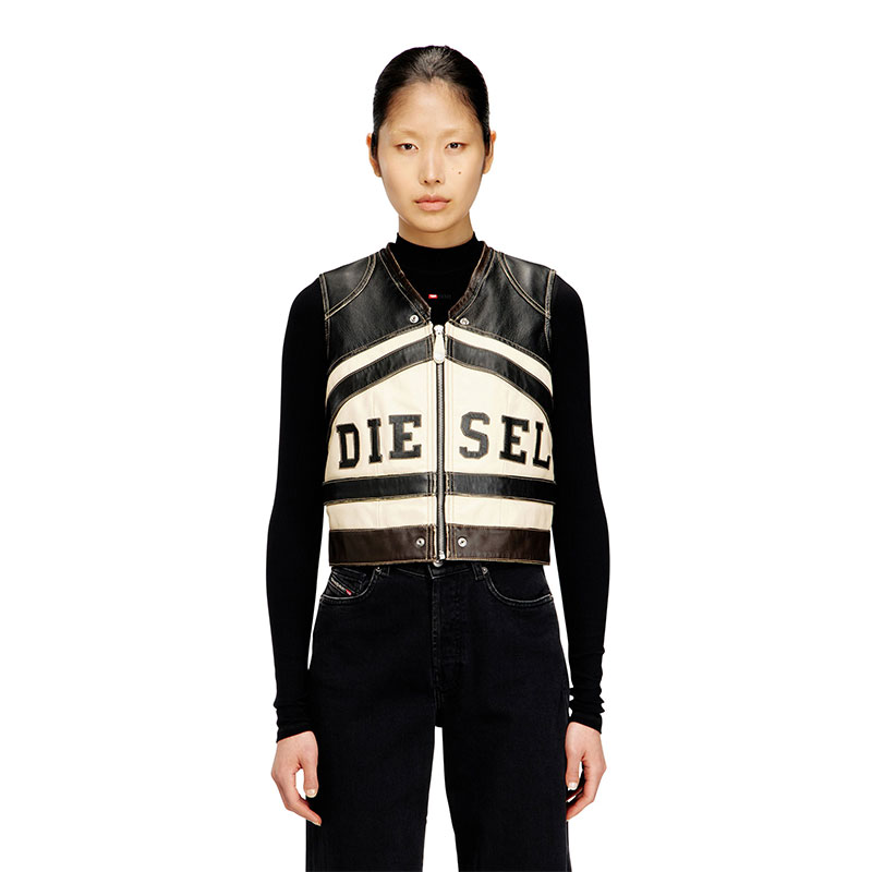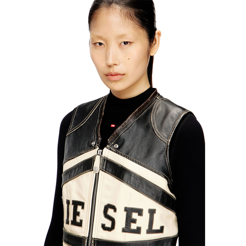 Leather vest crafted with contrasting panels and bold front Diesel lettering, featuring a zip closure and sleeveless cut. The fabric composition is leather, while graphic bands and visible stitching add visual structure to the design. The back is finished with clean paneling and horizontal stripes for a structured look, enhancing the iconic style and technical character of this female jacket.