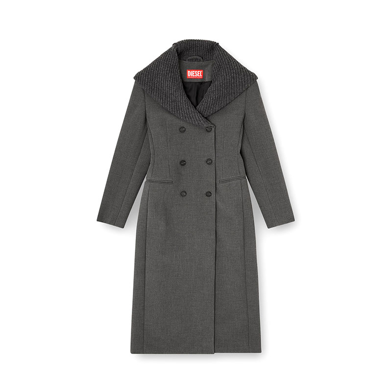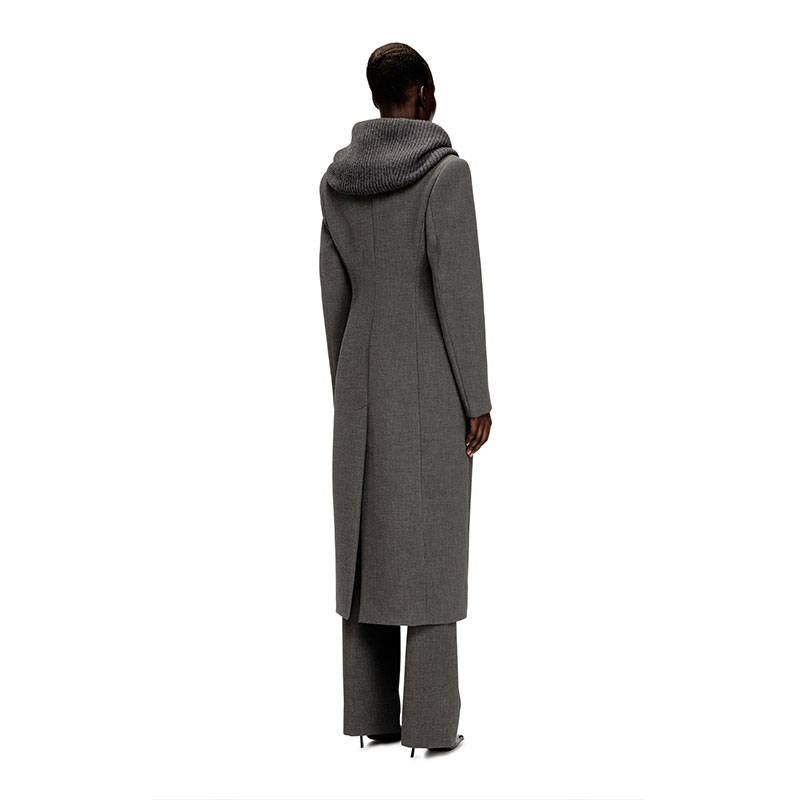 Tailoring, subverted with fluid ease. This women’s long coat is cut to a striking hourglass silhouette and topped with a cowl hood – rib-knitted from virgin wool, the headpiece adds a dramatic drape as it morphs into lapels. Rubber-touch faux-horn buttons fasten the double-breasted front, while a subtle metal Oval D plaque accents the back.