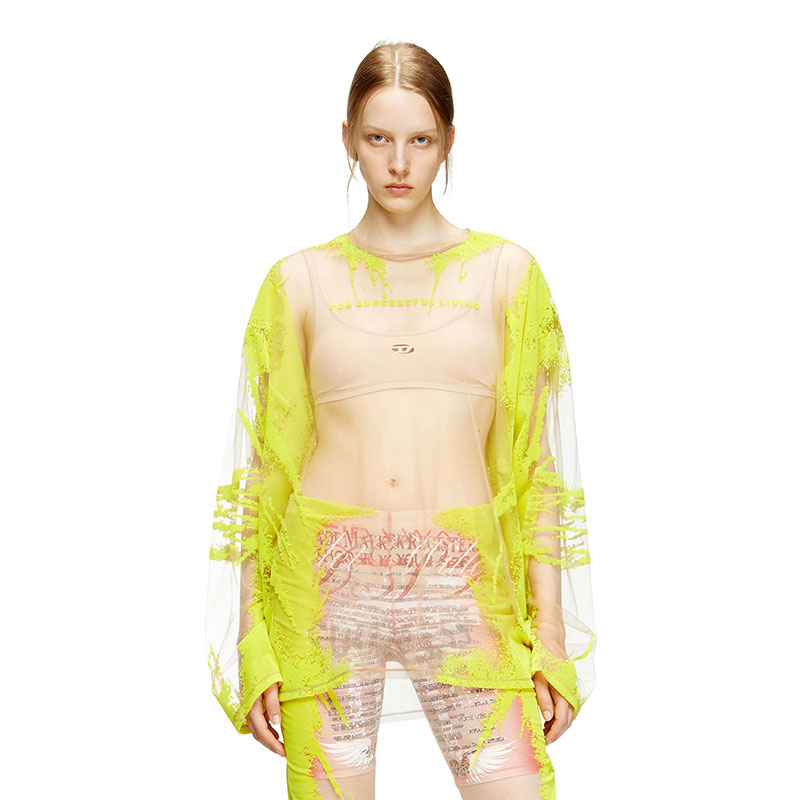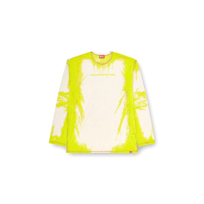 Men's long-sleeved T-shirt made from technical fabric designed to be see-through on most of the garment. This crewneck tee is featured in the Remaster collection, a celebration of the underground club scene and Diesel's long-standing alliance with the DJ community. Each piece is printed with custom graphics or quotes chosen by DJs participating in the project as a personal tribute to the music that changed their lives.