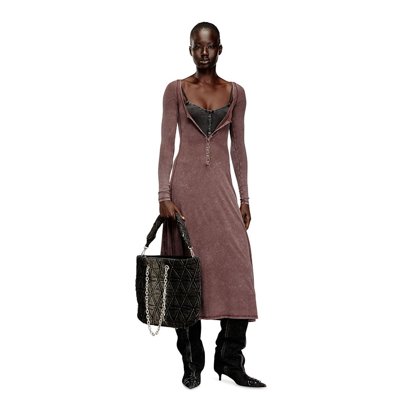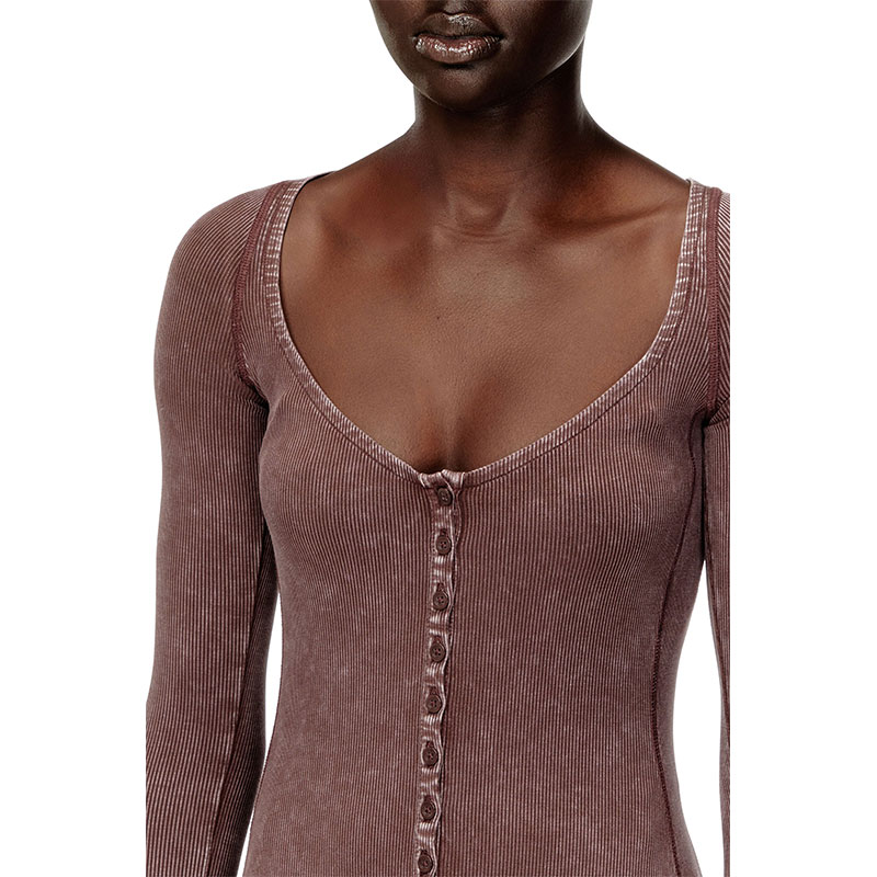 This women’s long-sleeve dress has a décolletage-baring Henley neckline and a slim bodice that flows into a softly draped midi skirt. Cut from ribbed jersey spun from stretch-enhanced ECOVERO viscose, it’s washed down to a marbled, lived-in fade and detailed with an embroidered Oval D on the back.