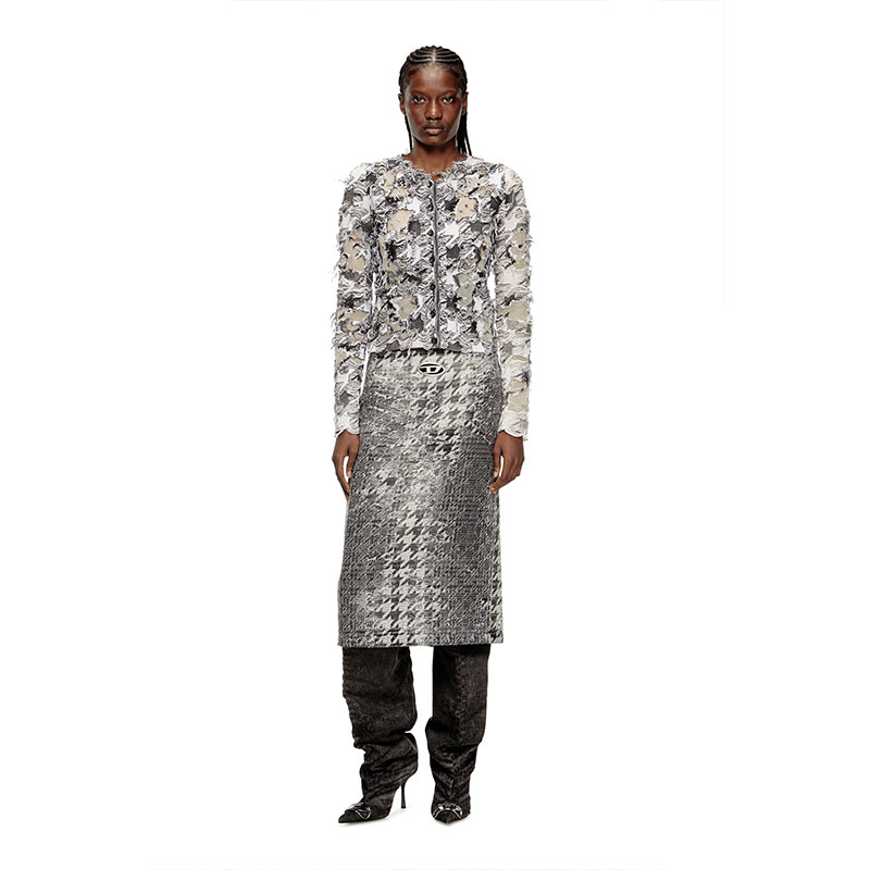 Part of the Fall Winter 2025 Runway looks, this women's A-line midi skirt features the iconic Oval D logo as a cut-out metal plaque.