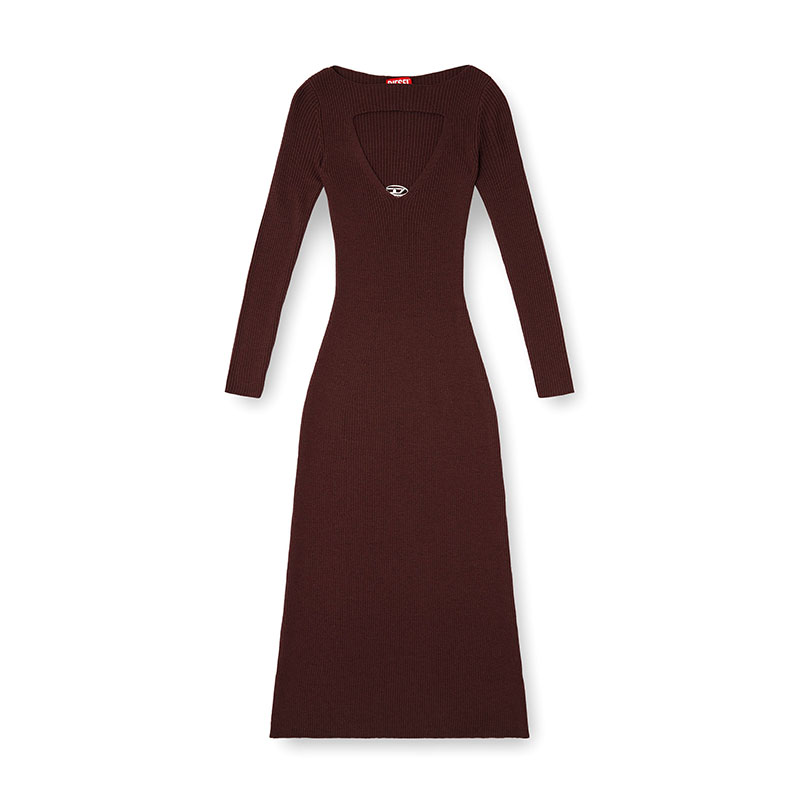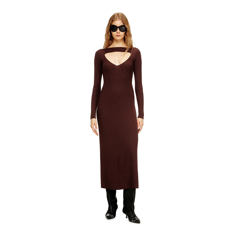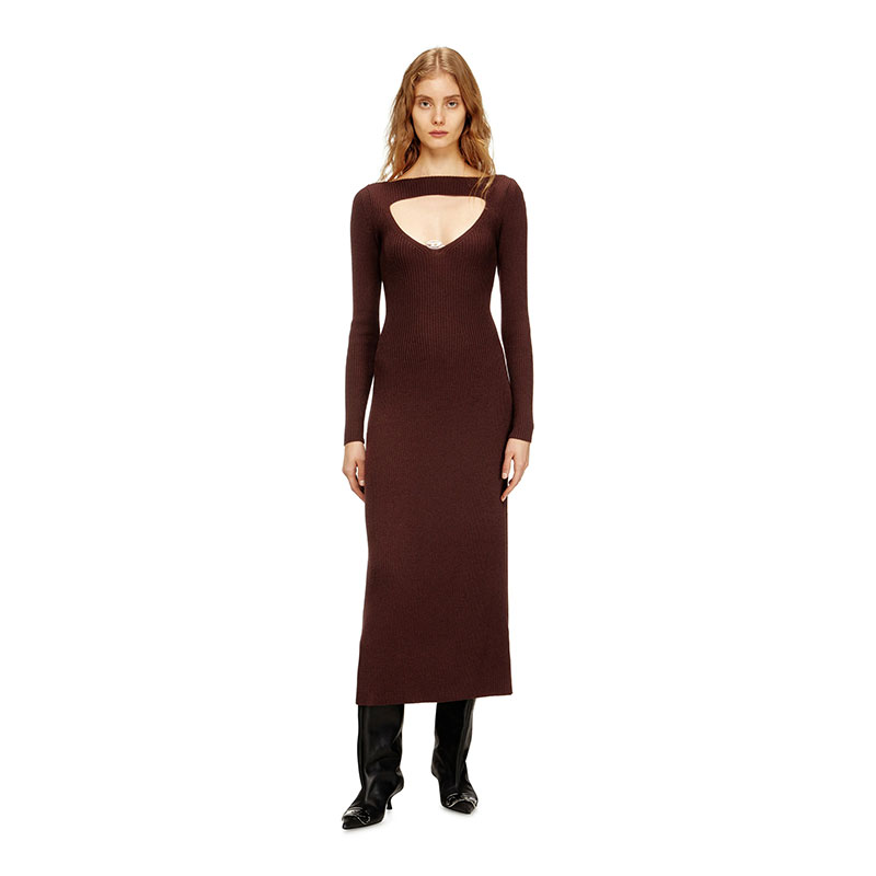 Midi wool dress with long sleeves, featuring a regular fit and a wrap-around silhouette. Crafted with 2x2 ribbing across the entire surface, it is distinguished by a triangle intarsia at the neckline. The Oval D logo is located at the lower corner of the cut-out, adding a distinctive element.