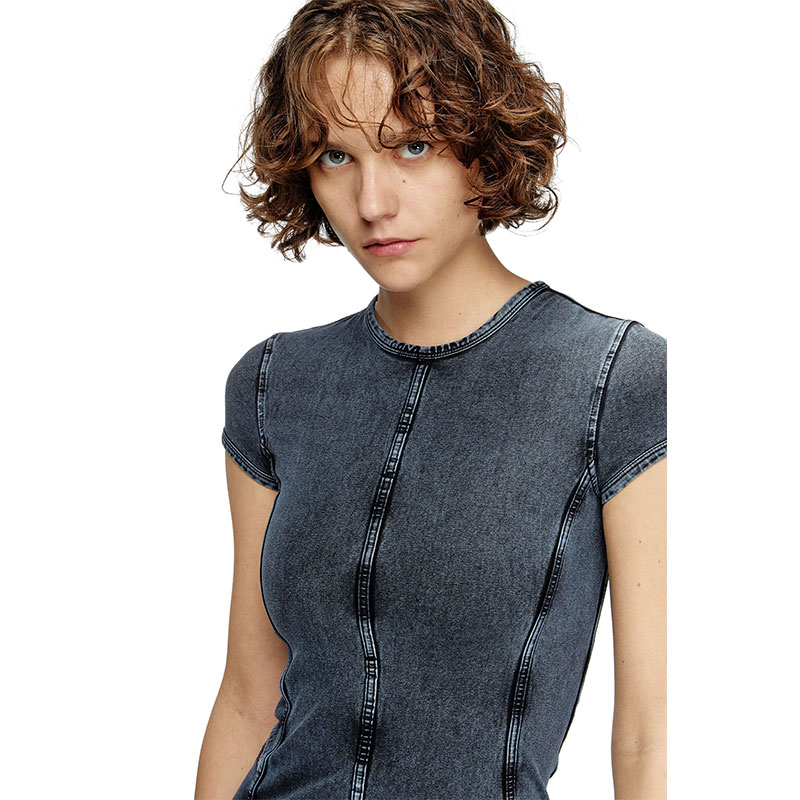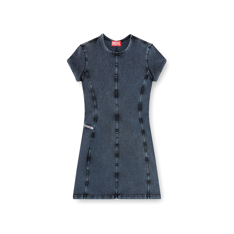 This slim-fit mini dress is made from stretch jersey, but is dyed and washed to look like faded indigo denim. Vertical panelling sculpts the body, detailed with our iconic fifth-pocket flag on the side.