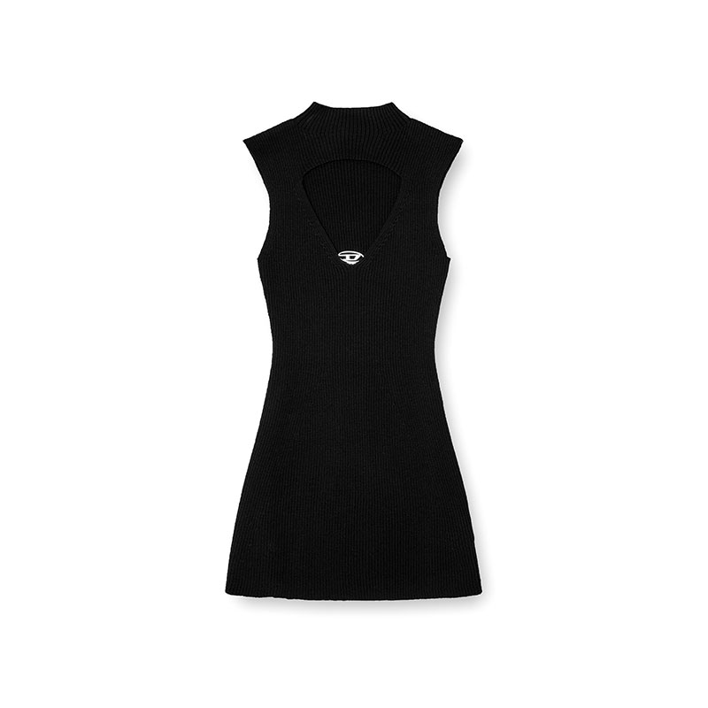 Sleeveless mini dress with a mock neck in pure wool featuring an elegant ribbed pattern. It is distinguished by a triangle inlay at the lower corner where the Oval D logo is applied.