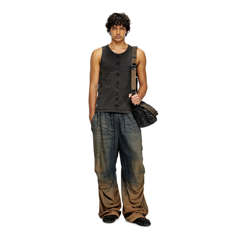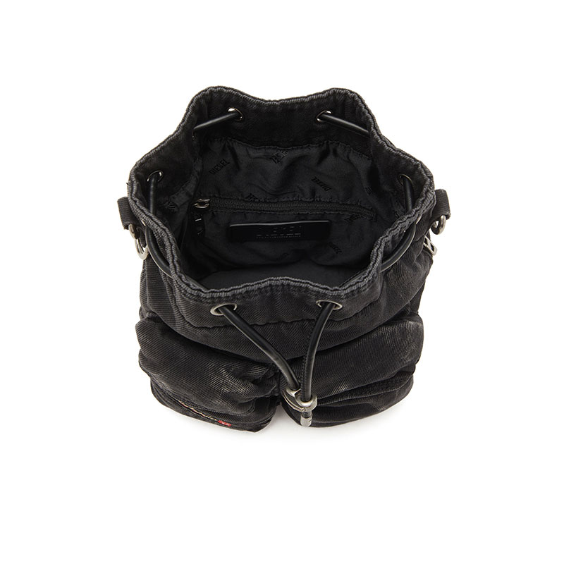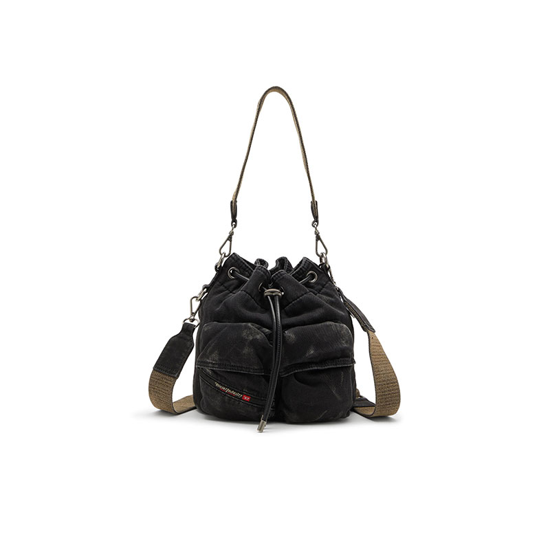 This unisex bucket bag is the ultimate utilitarian organiser. Crafted from Diesel's DNA fabric – denim – in a faded black wash, it’s kitted with easy-access flap pockets on the front, a zip pocket on the side and a convenient drawstring closure. The handle and shoulder strap can be detached, providing versatile carry options. Complete with the signature Diesel Industry flag.