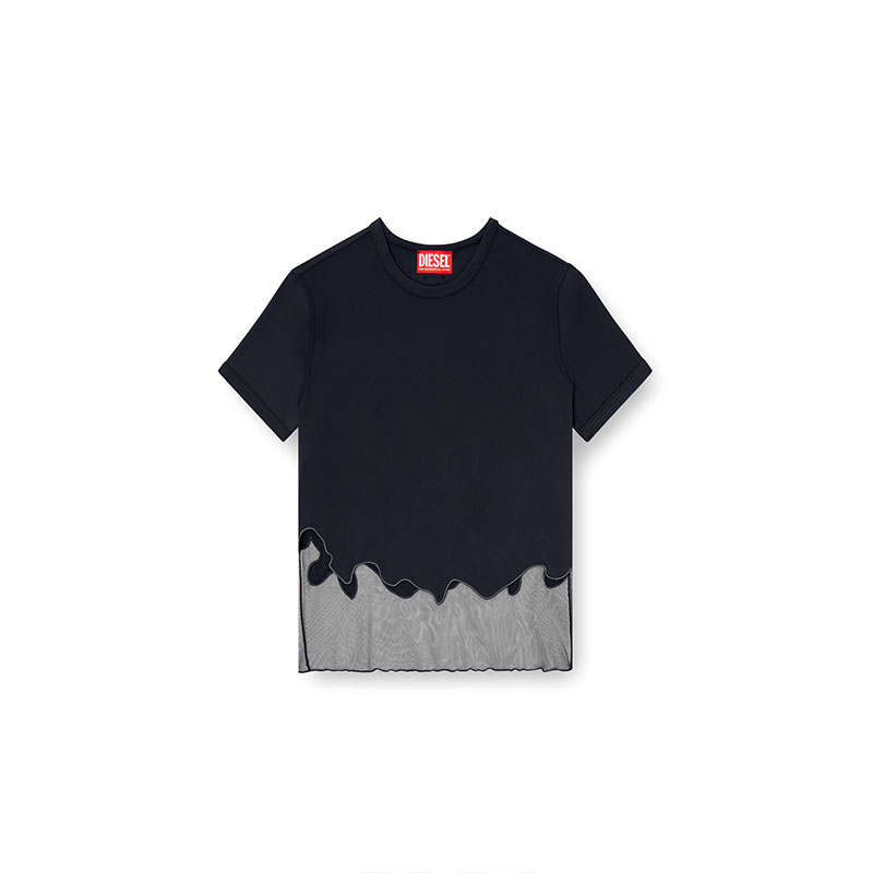 This women's T-shirt features an asymmetric see-through hem that ties in perfectly with the squiggly lines of cord embroidery. Made from black recycled nylon for a stretchy fit that sits close to the body, it's detailed with a metal Oval D on the back.