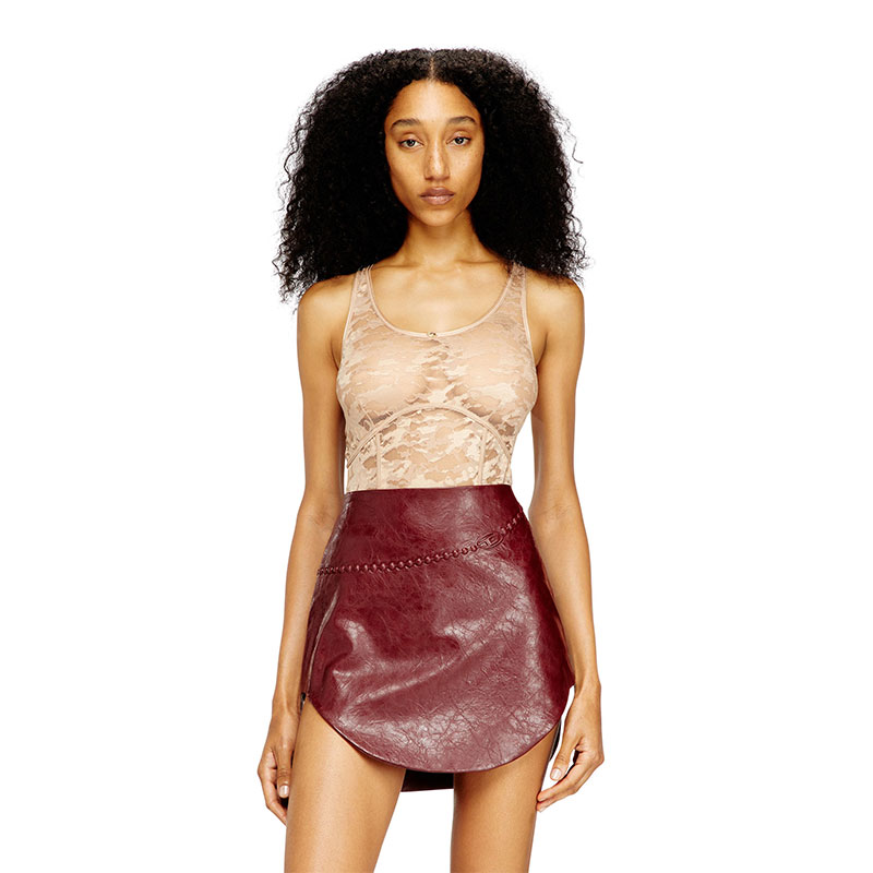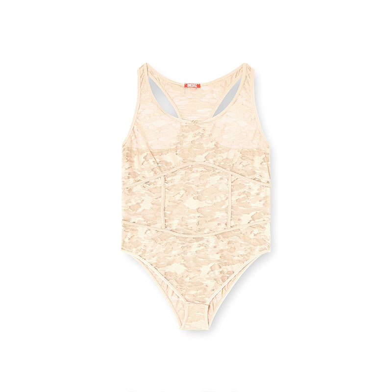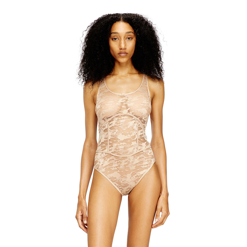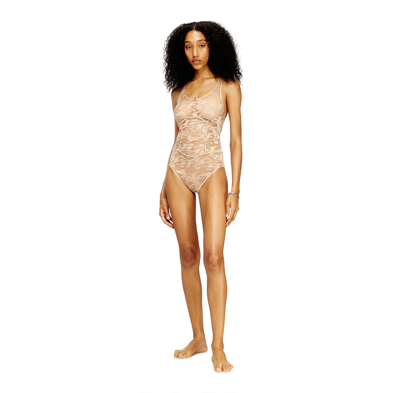 Crew neck nylon bodysuit with lace design, offering a sheer effect and a form-fitting silhouette that conforms to the body. Details like ribbed trims add a touch of elegance, while a small logo is located on the front.
