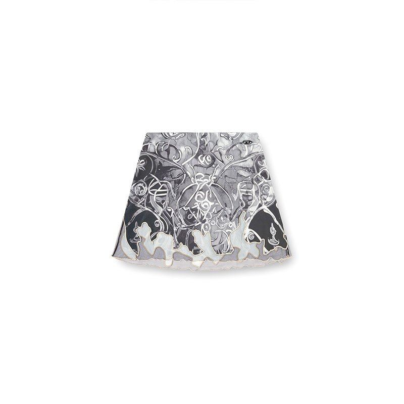 Cut from recycled nylon, this fluid mini skirt features a wallpaper-esque print that takes cues from Heraldic artwork. An asymmetrical tulle insert creates a doodle-effect hem edged with cord embroidery. A metal Oval D hallmarks the look.