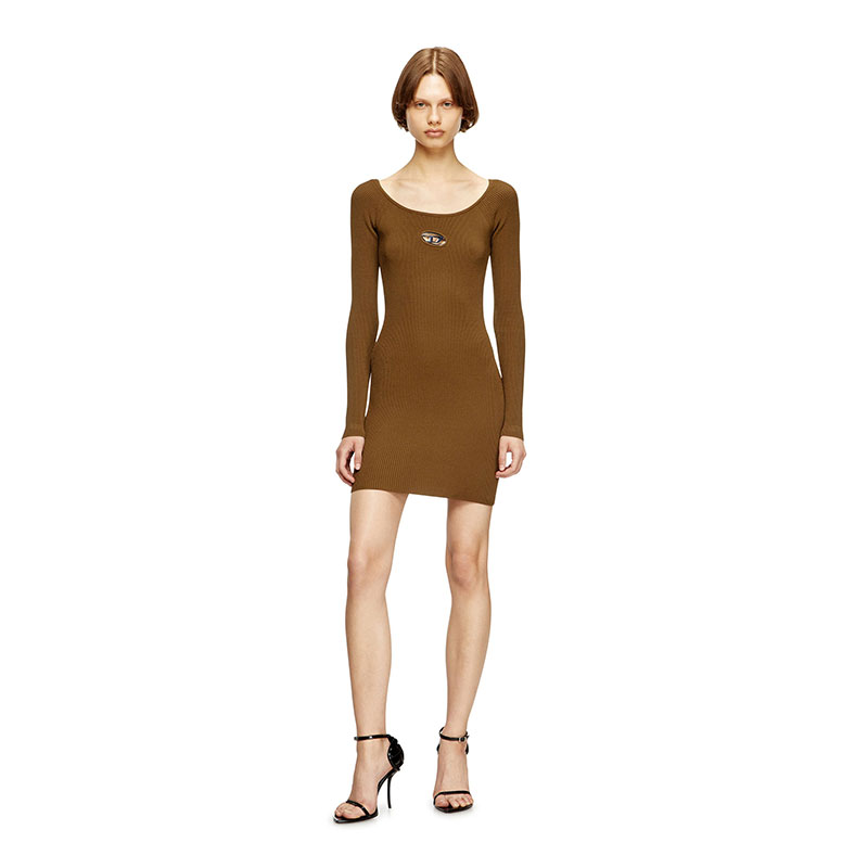This women’s long-sleeve dress has a metal Oval D plaque nestled in the chest cut-out and a wide neckline that can be worn off-the-shoulder. It’s made from close-fitting ribbed knit containing viscose from responsibly managed forests and falls to a mini length.