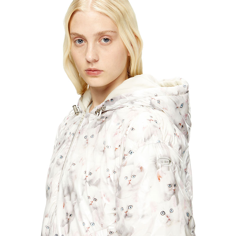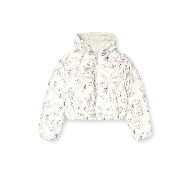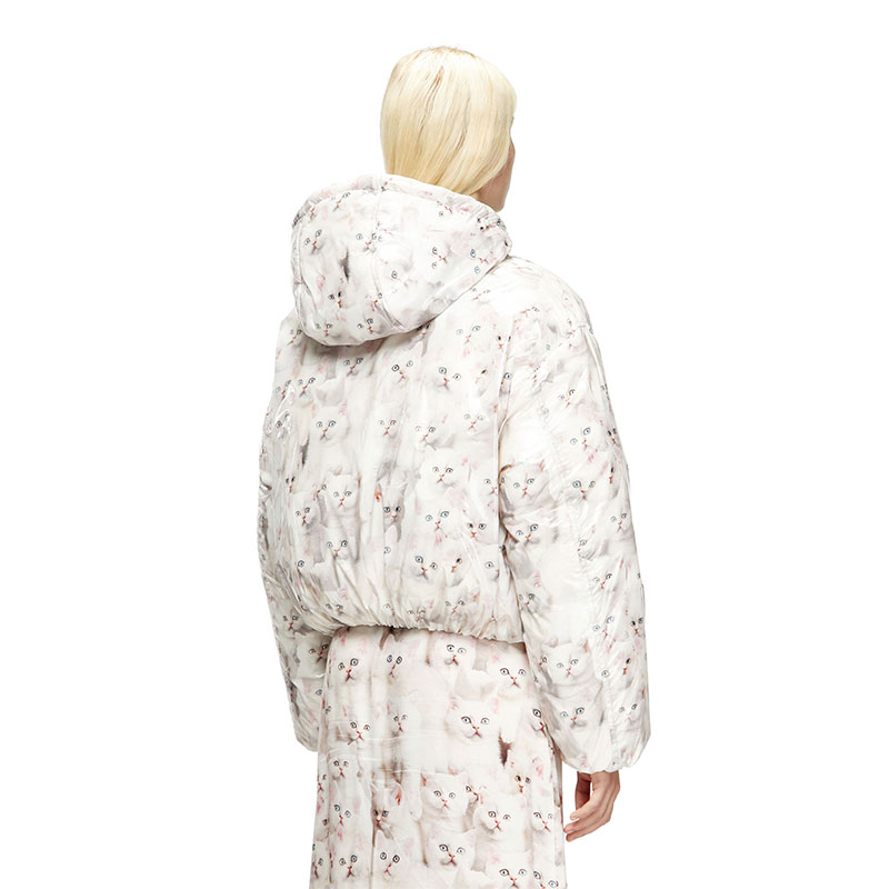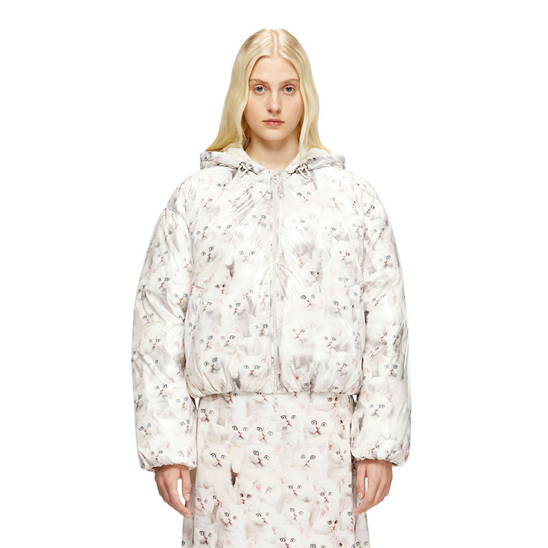 Printed with fluffy white kittens, this women’s puffer jacket feels playful and optimistic. It’s made from glossy coated nylon and packed with padding for winterproof insulation. The two-way zip and drawstrings at the hood and hem adjust the silhouette for maximum comfort.