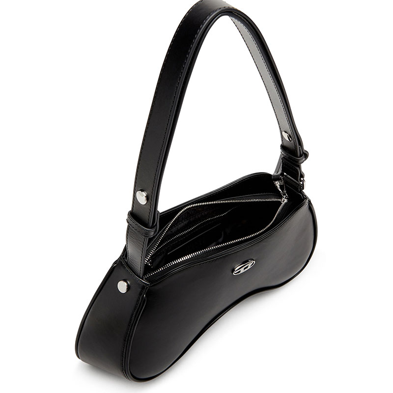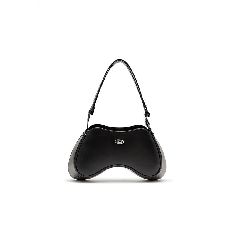 Sleek and playful, this women's shoulder bag is characterised by a sinuous shape inspired by gaming controllers. It's crafted from smooth leather with a semi-gloss finish, embellished by shiny Oval D hardware and fastened with a zipper at the top. The shoulder strap is adjustable to customise the drop.