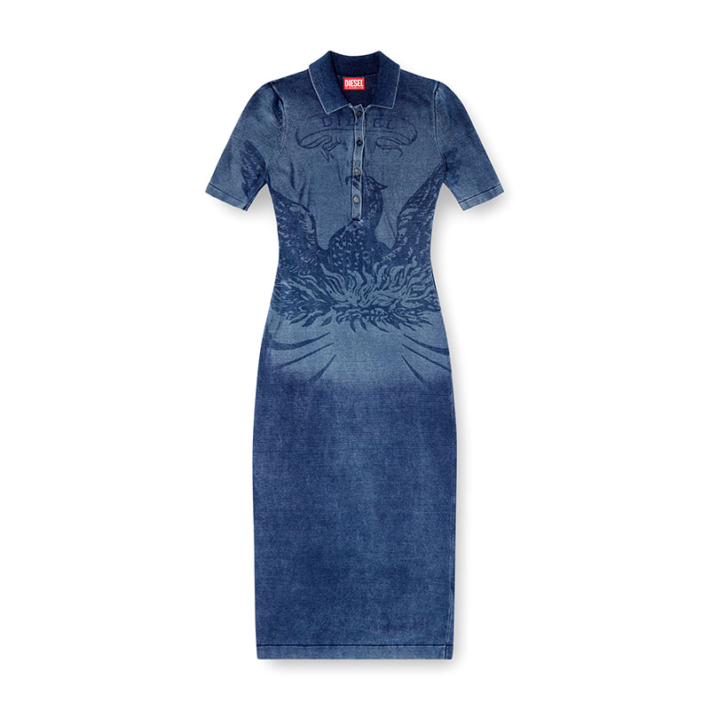 Women’s midi polo dress with three-quarter sleeves and a close-fitting silhouette. Inspired by Diesel's DNA fabric – denim, this blue knitted style is made from organic cotton dyed in real indigo and has a stonewashed finish. A bold laser-etched artwork depicting the Phoenix logo decorates the front.